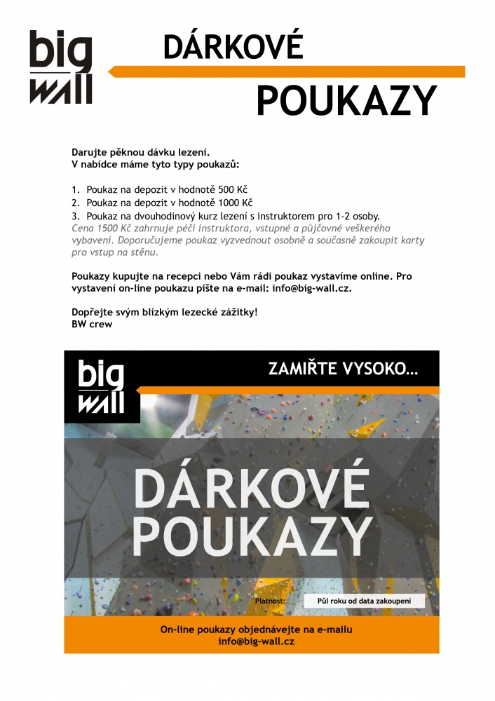 Dárkové poukazy na dvouhodinové lekce lezení nebo na složení depozitu pro vás budeme před vánočními svátky vystavovat on-line až do pondělí 22.12. 2025. V úterý 23.12. 2025 bude ještě pokračovat prodej na recepci BigWallu.